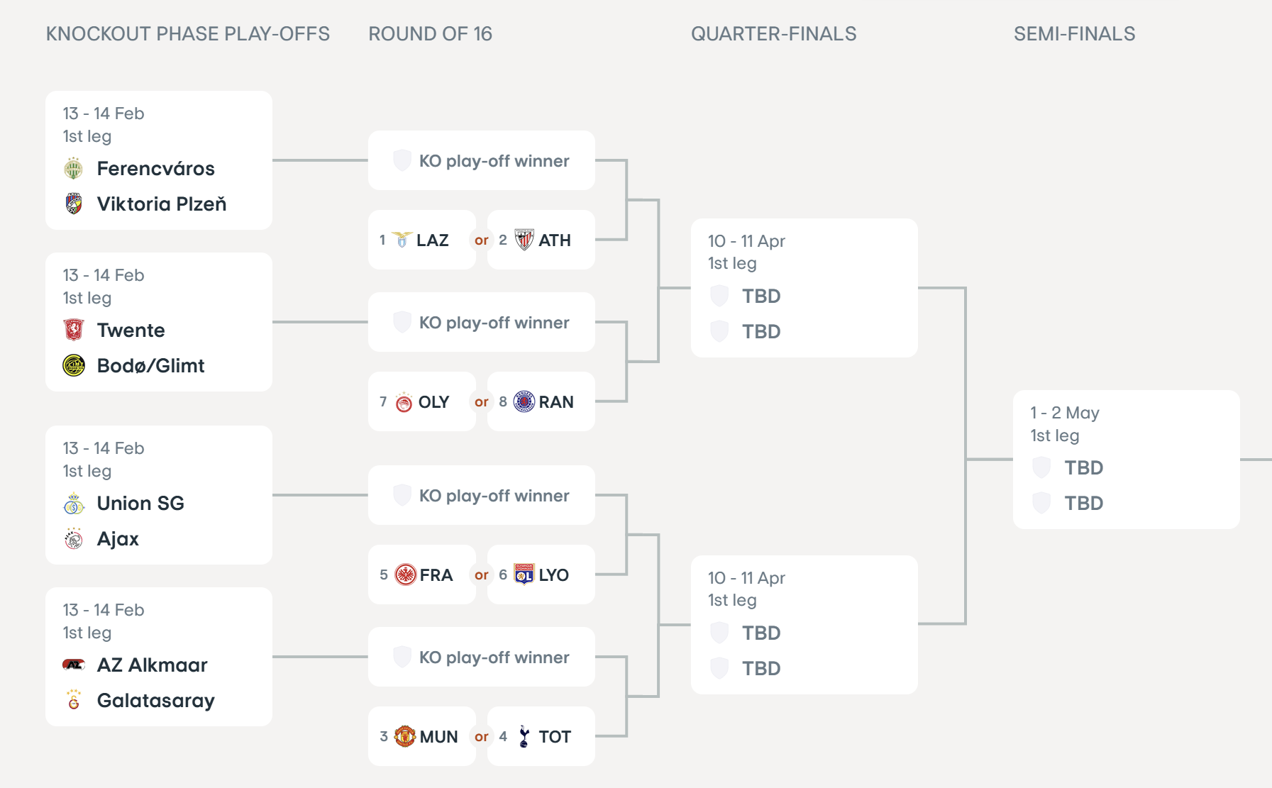 유로파리그 16강 플레이오프에서 승리한 팀들은 미리 정해진 페어링을 통해 상대가 결정되며, 미트윌란이 승리하더라도 맨체스터 유나이티드 또는 토트넘과 맞붙는 험난한 일정이 기다리고 있습니다.