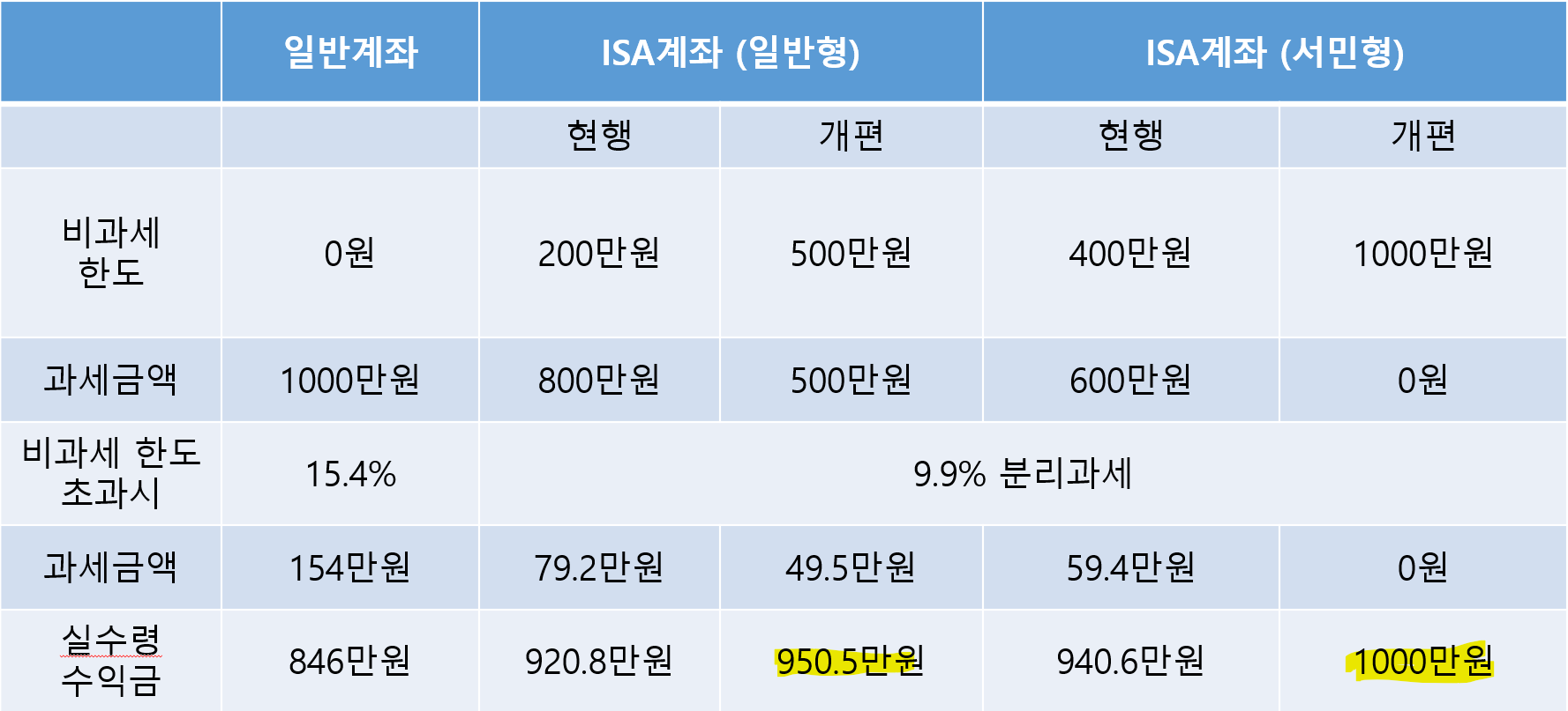 - ISA 계좌는 비과세 한도를 초과한 금액에 대해서는 99.9% 분리과세를 하며, 이번 개편으로 최대 납입 금액이 늘어나 노후 자금 준비용도 가능해졌다.