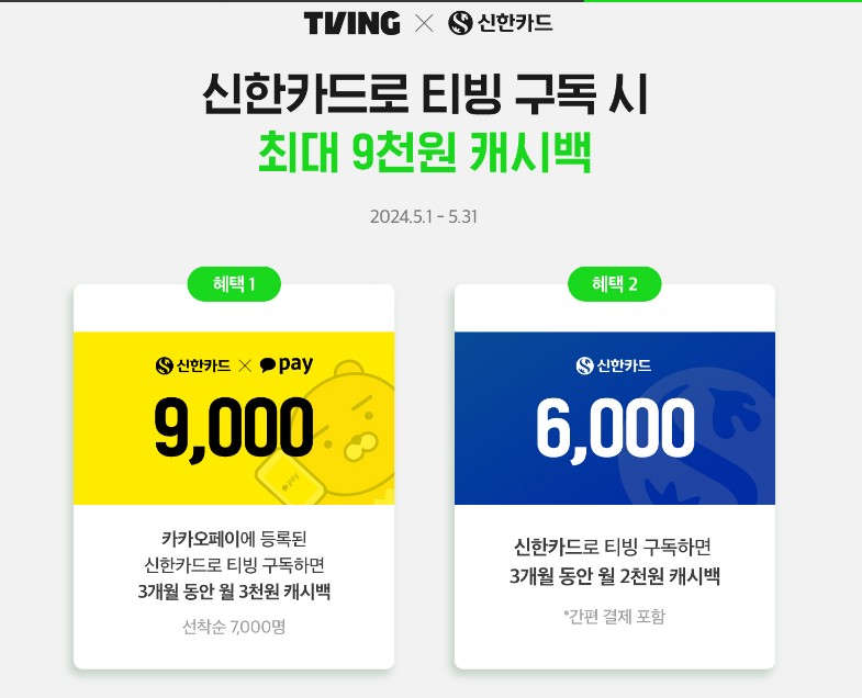 - 4월에는 100원 이벤트를 하였으나 아쉽게 종료되었습니다. 5월에는 신한카드나 토스를 이용하여 구독하면 할인을 해주는 행사를 진행하고 있습니다.