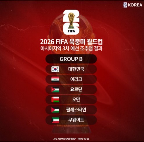 대한민국은 B조에 편성되었으며, 이라크, 요르단, 오만, 팔레스타인, 쿠웨이트와 경쟁하게 됩니다. B조 내에서 상대적으로 우위를 점하고 있는 한국은 본선 진출 가능성이 높다고 평가받고 있습니다.