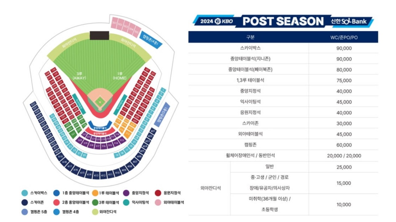 티켓 예매는 온라인을 통해 진행되며, 각 경기장별 좌석에 따라 티켓 가격이 다릅니다. 아래는 주요 구장의 티켓 가격을 정리한 표입니다.